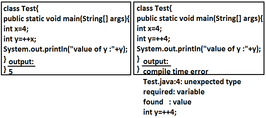 Ex 2 : int x = 4; int y = ++4; System.out.pritnln(y); C.E: unexpected type required: varialbe found : value