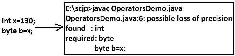 Ex 1: byte a=10; byte b=20; byte c=a+b; //byte c=byte(a+b); valid System.out.println(c); CE : possible loss of precession found : int required : byte